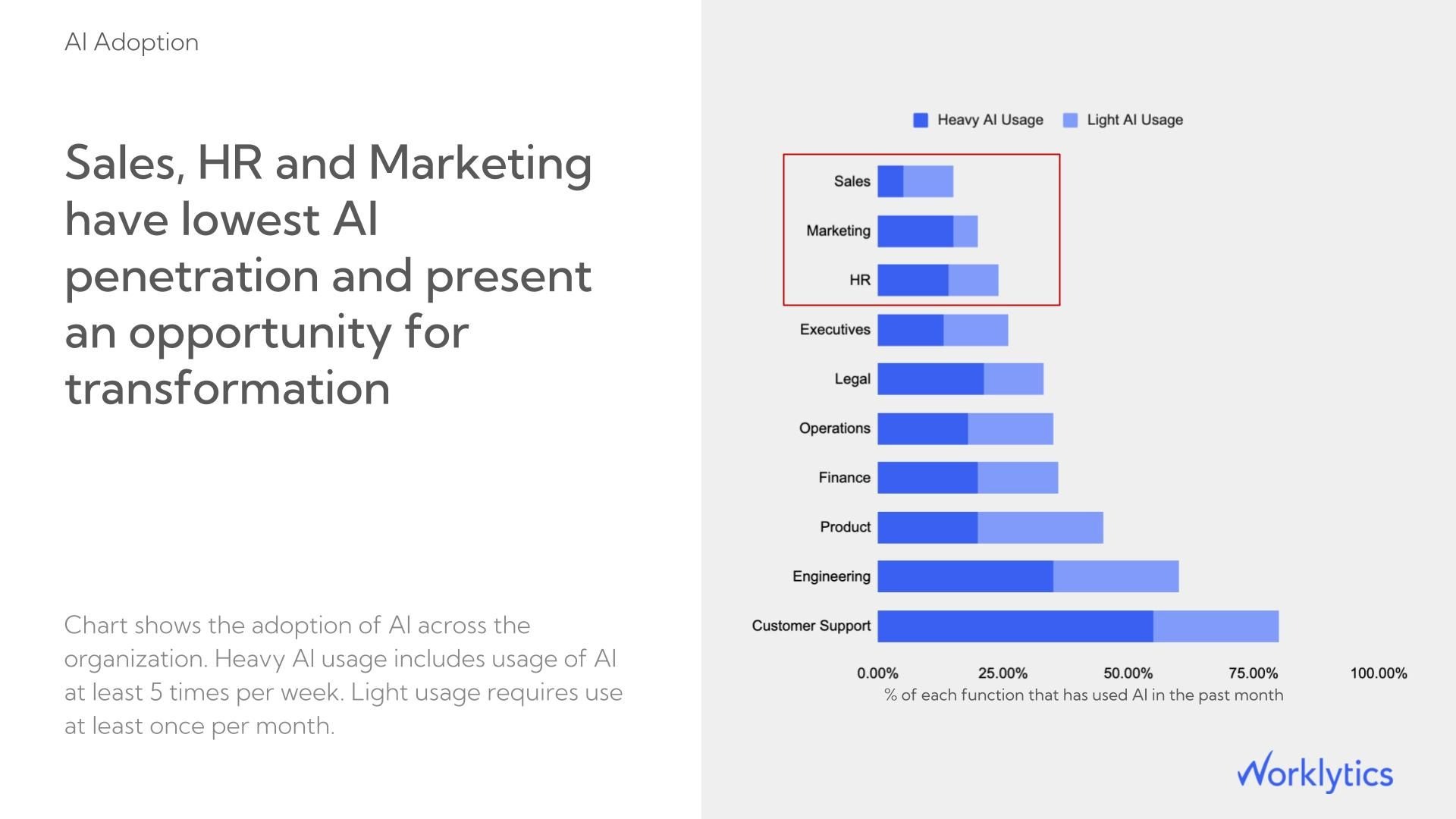 Worklytics identifies the departments and managers where AI adoption has stalled, which is where most enterprise AI programs lose ROI without ever knowing it. Targeted interventions at the manager level where behavior is modeled for entire teams consistently produce faster adoption gains than organization-wide training campaigns.