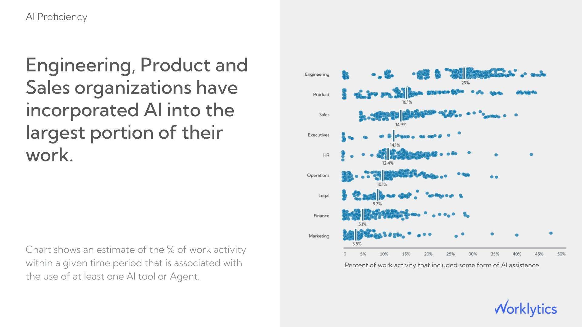 Worklytics links AI usage signals to existing productivity metrics by comparing output and collaboration patterns between high-adoption and low-adoption teams over the same period. This turns "we spent $X on AI licenses" into a defensible ROI calculation for the board rather than a utilization report.