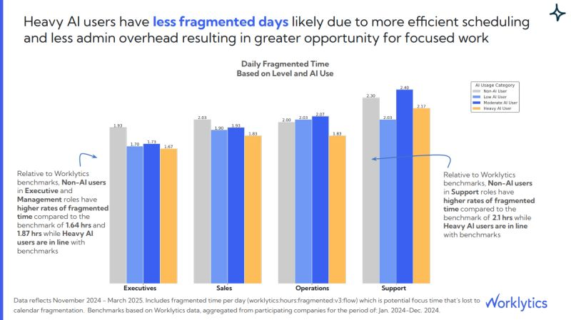 In executive roles, non-AI users average about 1.93 hours of fragmented time per day. Heavy AI users reduce that by 13%.
