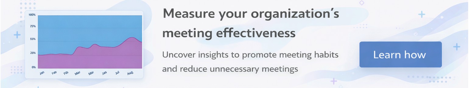 For a more operational approach, Worklytics provides benchmarked dashboards and trend data across meeting metrics, including meeting load, size, and focus-time impact. Leaders can test changes and verify whether adjustments improve meeting effectiveness over time.