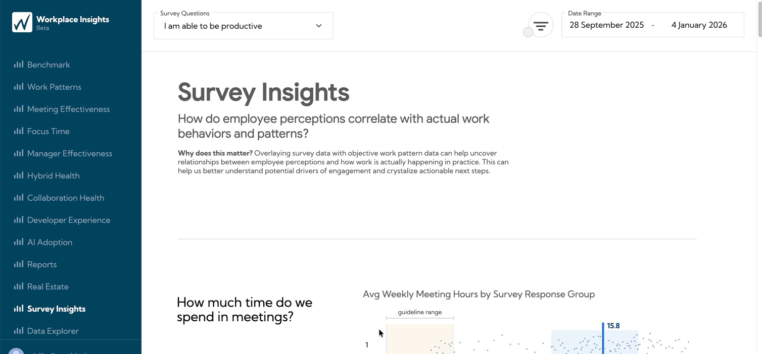Our new Survey Insights dashboard lets you overlay survey responses with objective work pattern data—making it easier to explore relationships between how work feels and how it’s actually happening day to day.