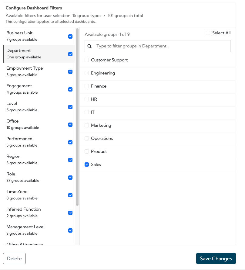 For example, a Sales leader can be restricted to only Sales-relevant functions in filter dropdowns—keeping dashboards focused, relevant, and safe to share broadly.